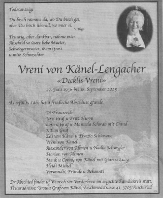 Leider mussten wir am 18. September von unserem langjährigen Aktivmitglied und Ehrenmitglied Vreni von Känel-Lengacher Abschied nehmen.